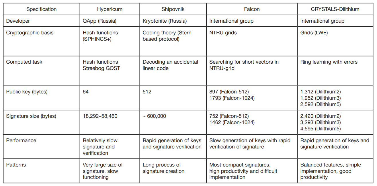 Table. Comparison of post-quantum cryptographic algorithms