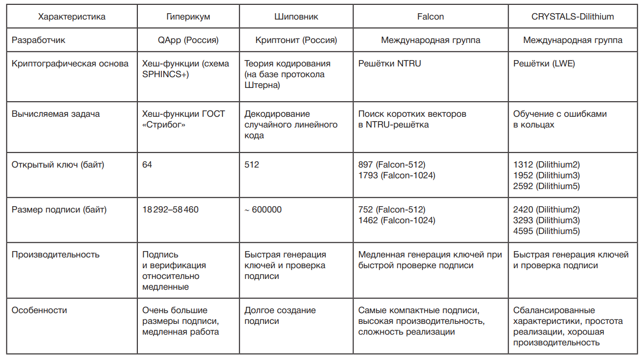 Таблица. Сравнение постквантовых алгоритмов криптографии