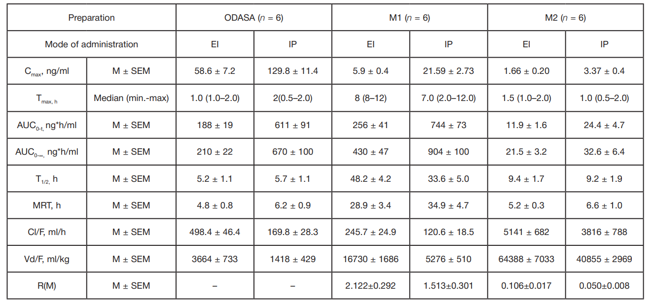 Compliance with ethical standards: the study was conducted in compliance with all ethical standards recommended in the Russian Federation. Rabbits were selected to evaluate the pharmacokinetic parameters and relative bioavailability of ODASA as other non-rodent species. The animals were kept in individual cages of a sufficient size. Access to water and mixed feed was available free-choice, except for 4 hours before administration and 2 hours after administration of the investigational preparation. The animals were housed at room temperatures of 20 °C, humidity of 40–65%, and a 12/12 h light–dark cycle. The experimental animals were under the supervision of a veterinarian throughout the experiment. Each group had a minimum allowable sample size for pharmacokinetic studies in the Russian Federation. This study was approved by the Independent Ethics Committee of the Federal State Budgetary Educational Institution of Higher Education Yaroslavl State Medical University of the Ministry of Health of the Russian Federation, Protocol No. 2 dated 04/20/2025.
